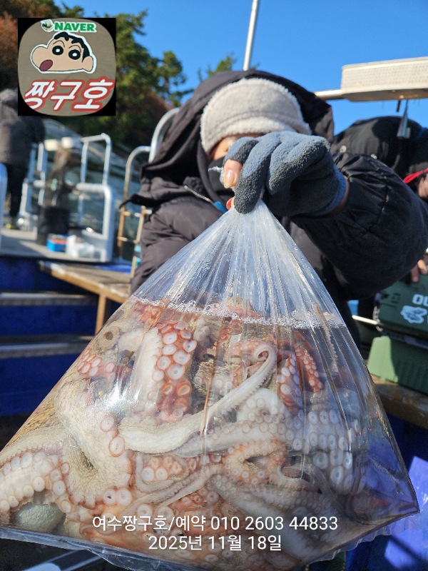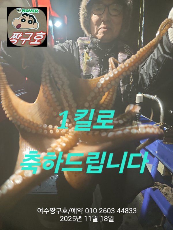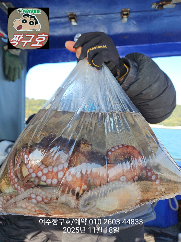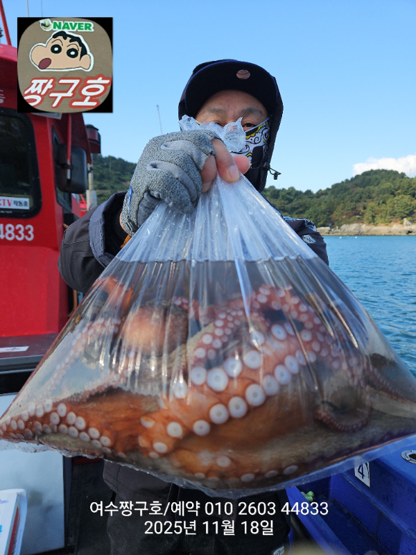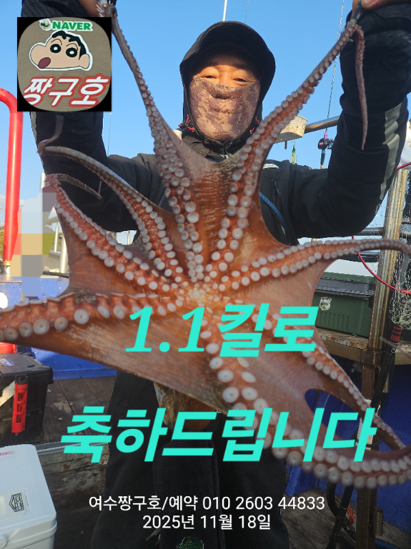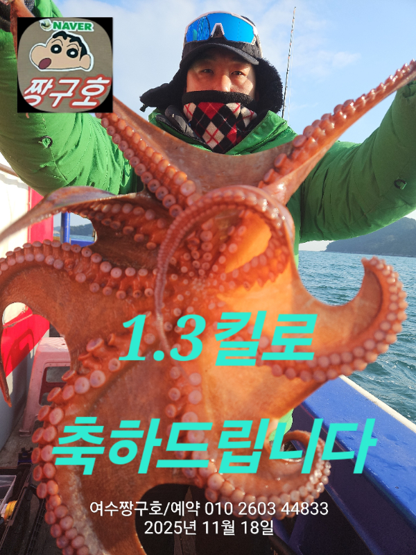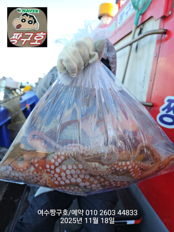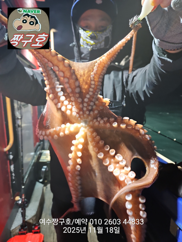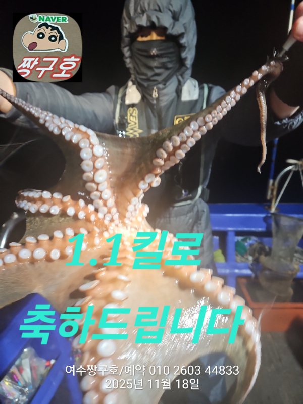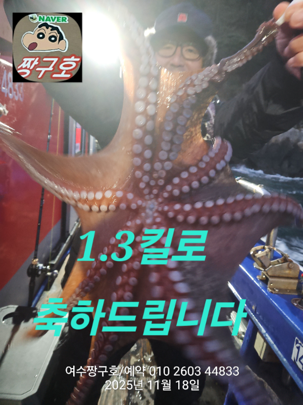 | 제목 : 여수 짱구호 11월18일(화)왕문어 1.3k 1.3k 1.1k 1.1k 1.0k 종일반 조황 (5수) | ||