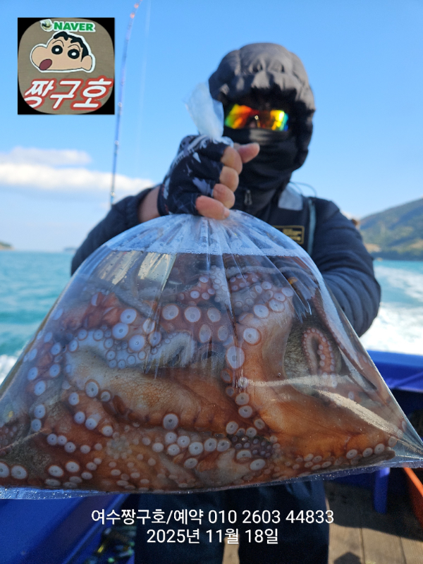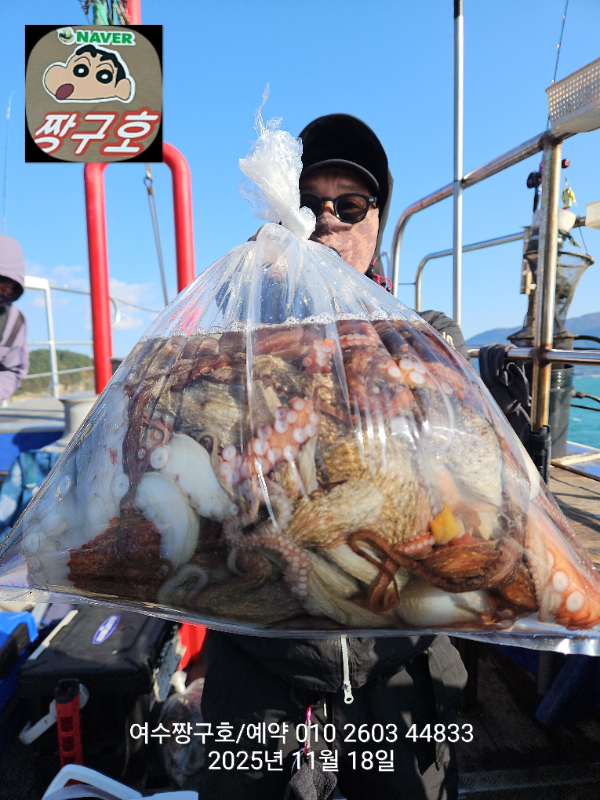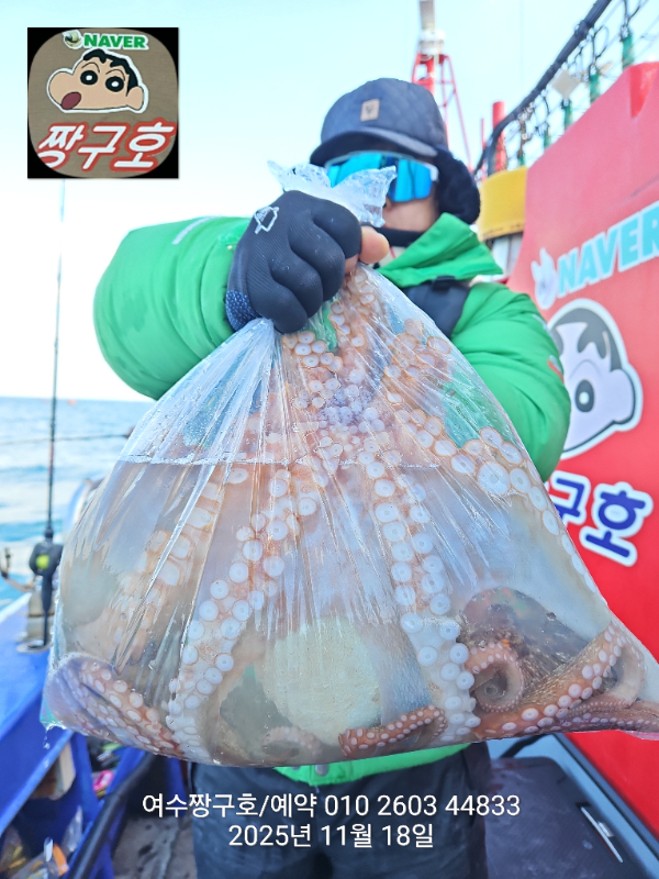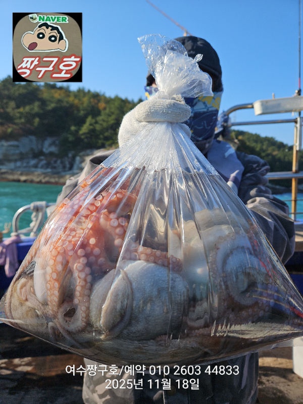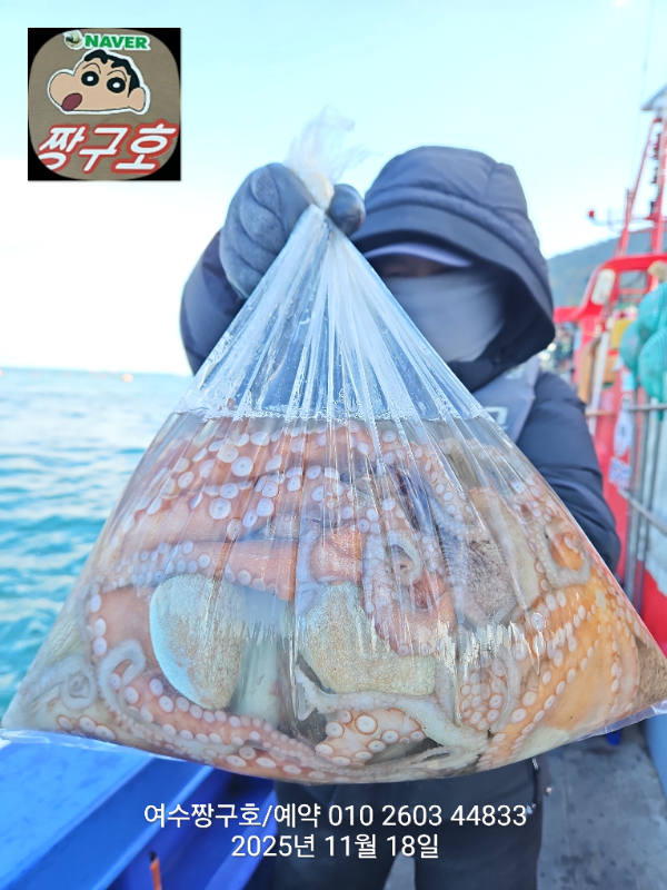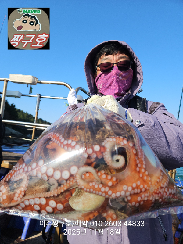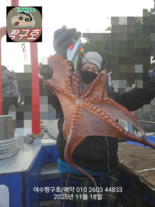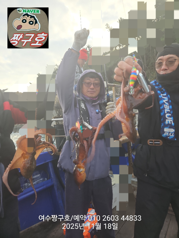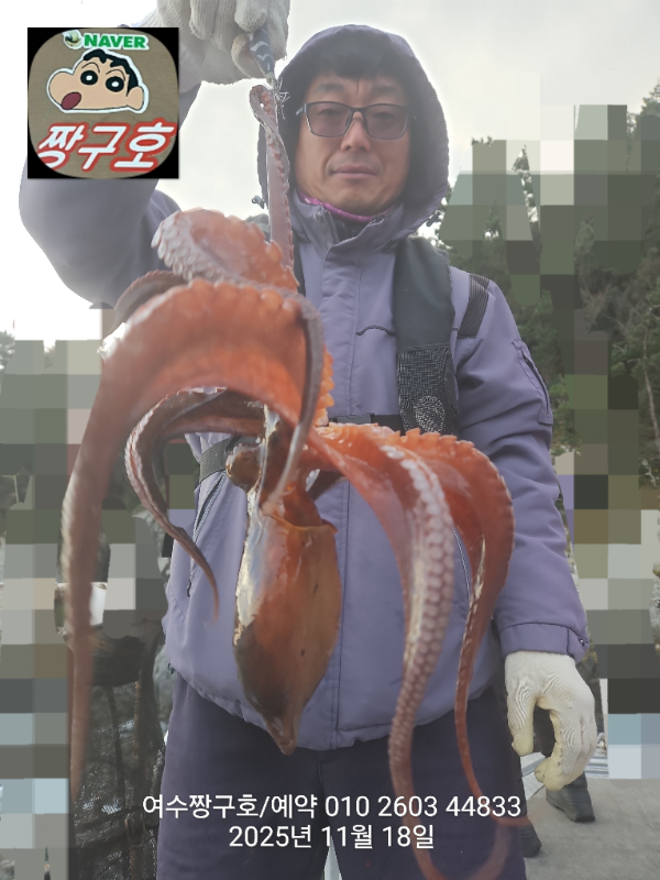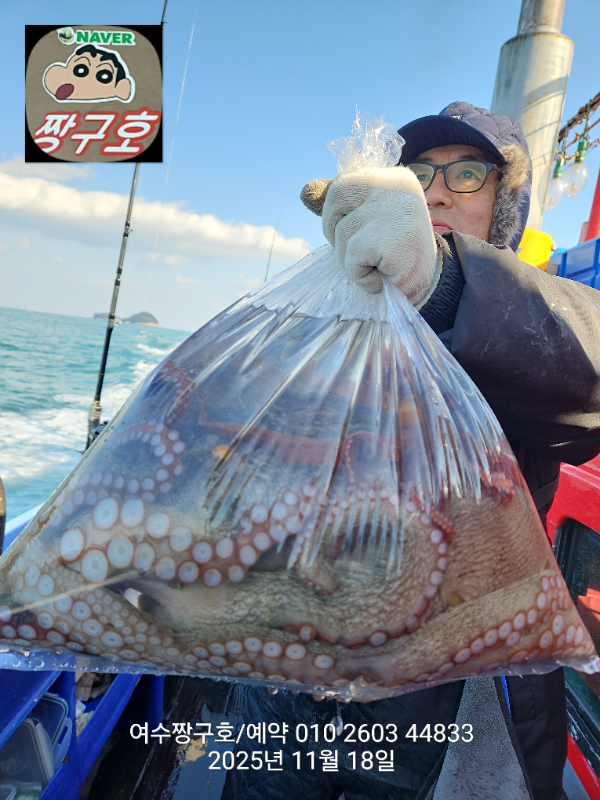 | 제목 : 여수 짱구호 11월18일(화)왕문어 1.3k 1.3k 1.1k 1.1k 1.0k 종일반 조황 (5수) | ||