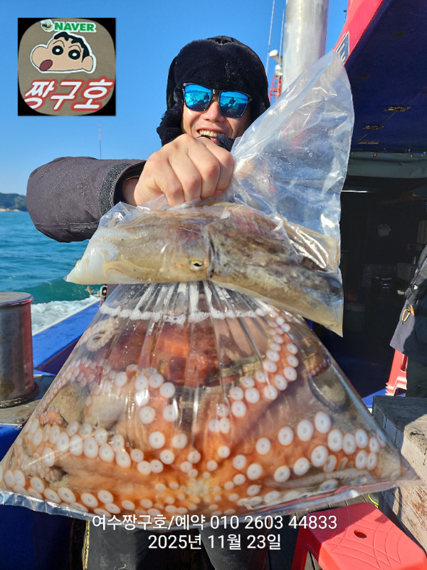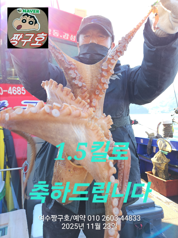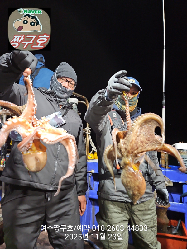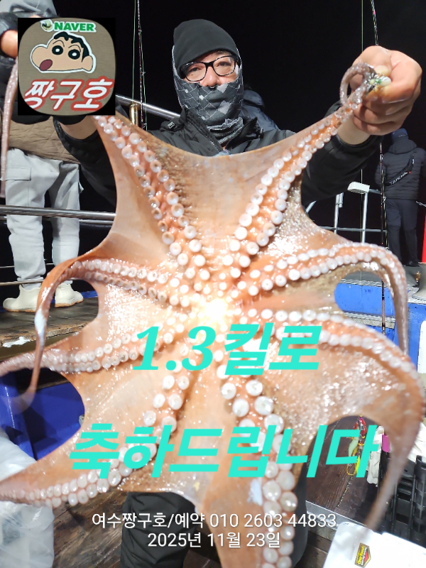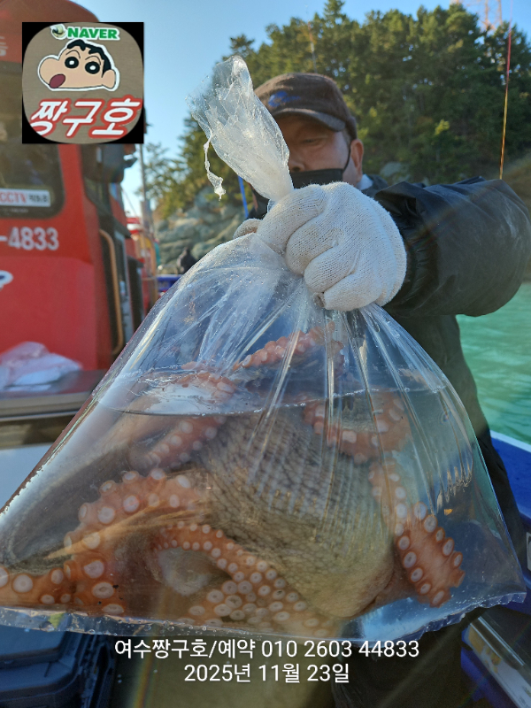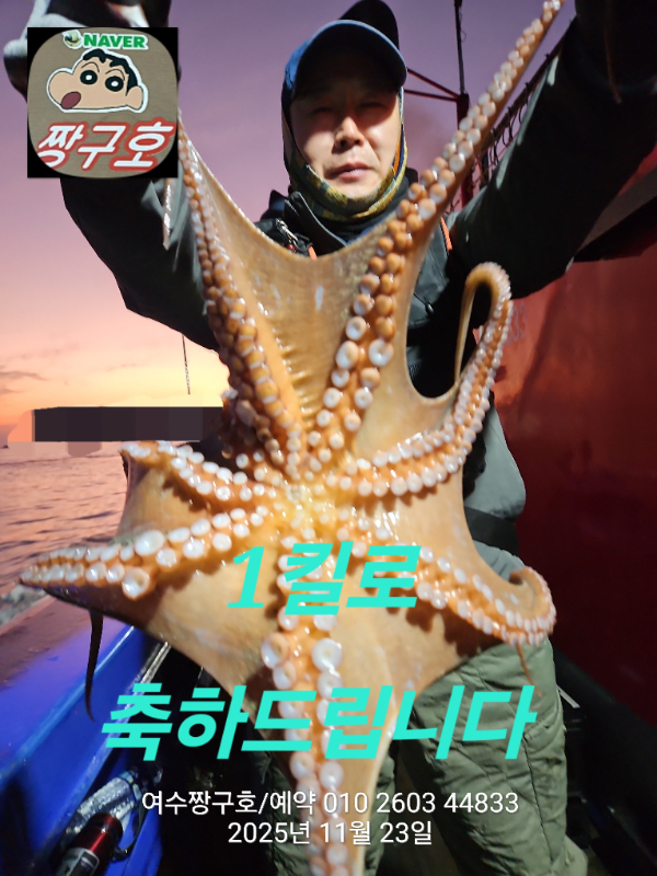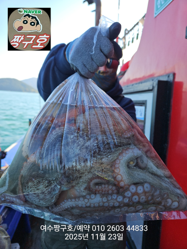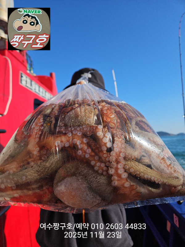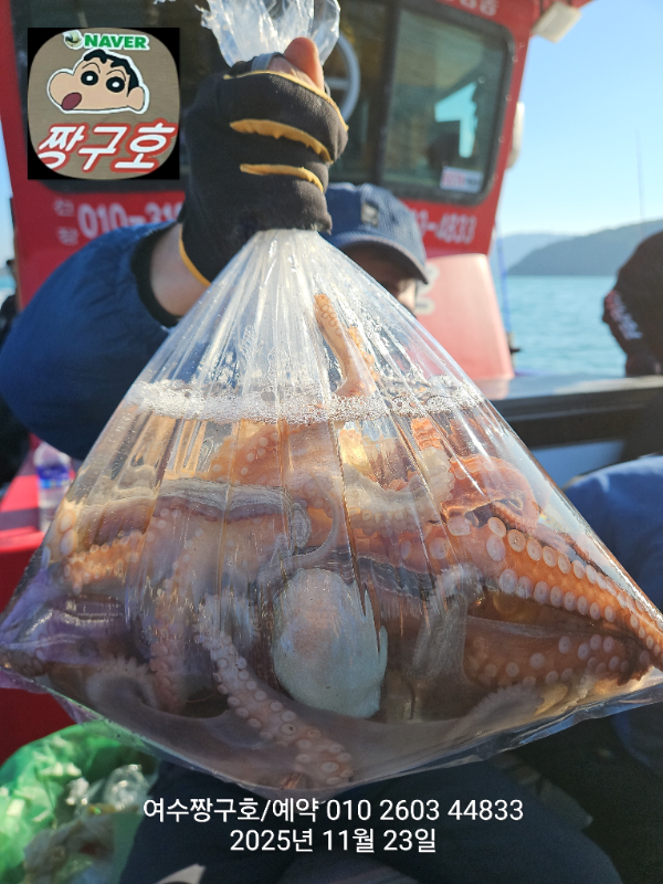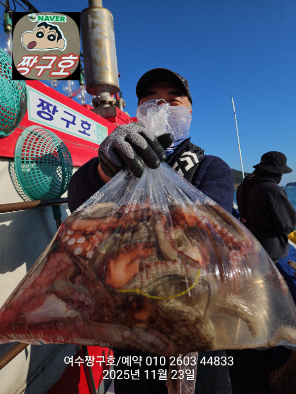 | 제목 : 여수 짱구호 11월23일(일)왕문어 1.5k 1.4k 1.3k 1.2k 1.1k 1.0k 조황(6수) | ||