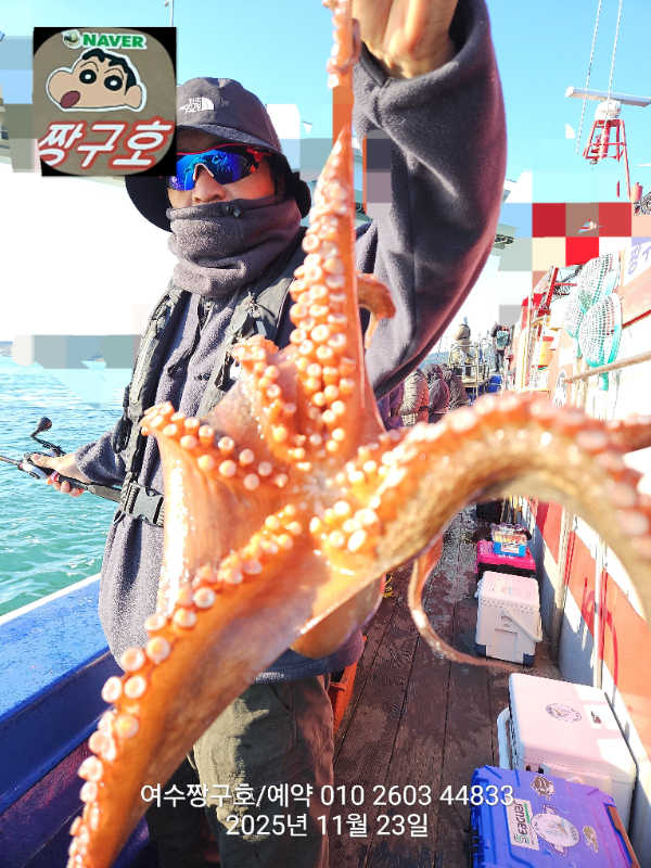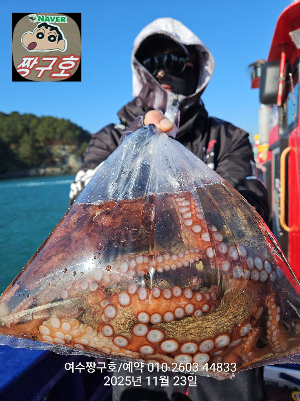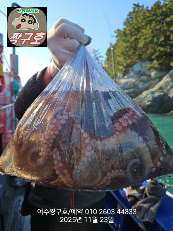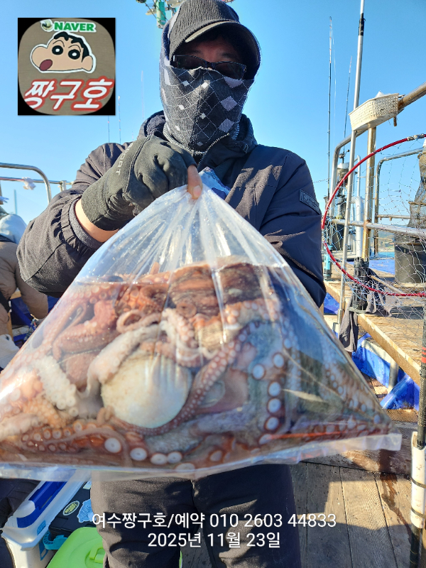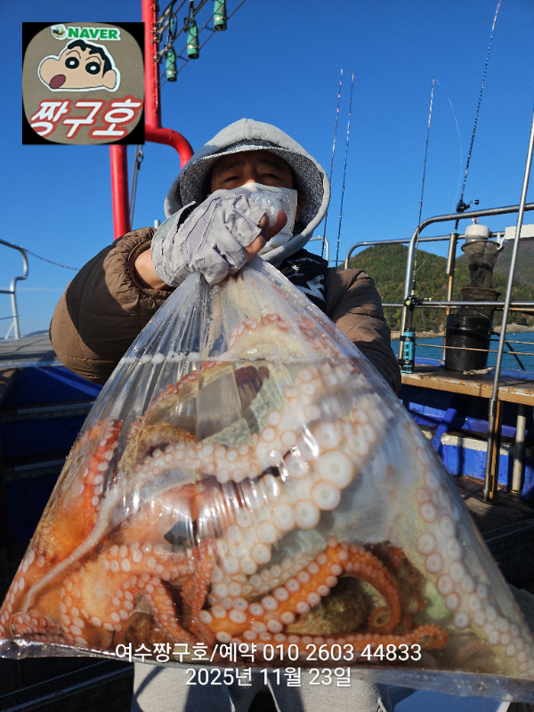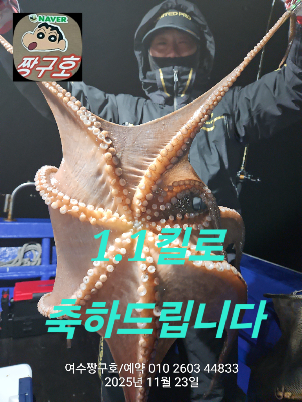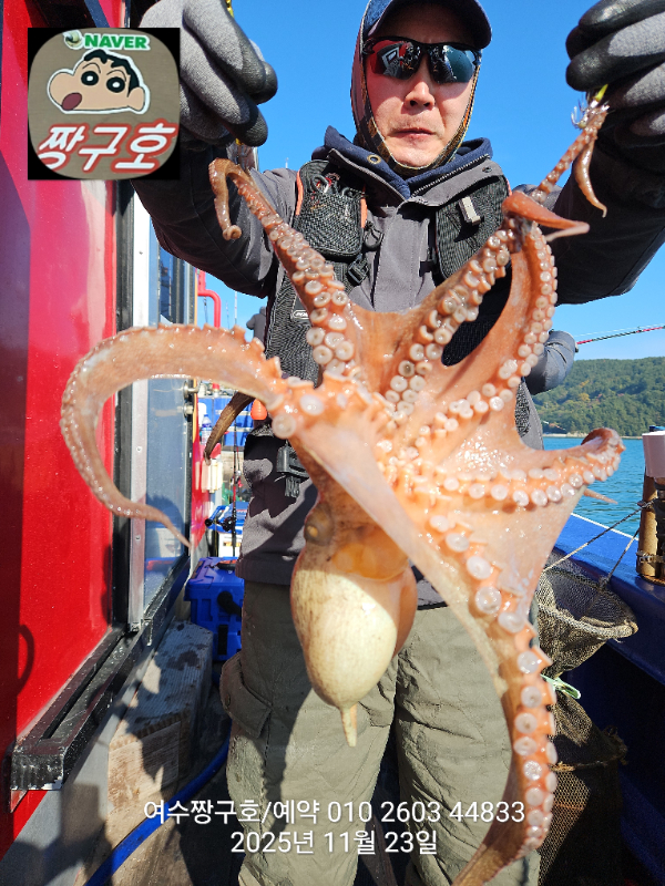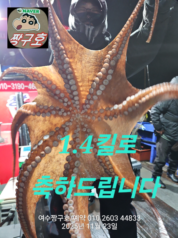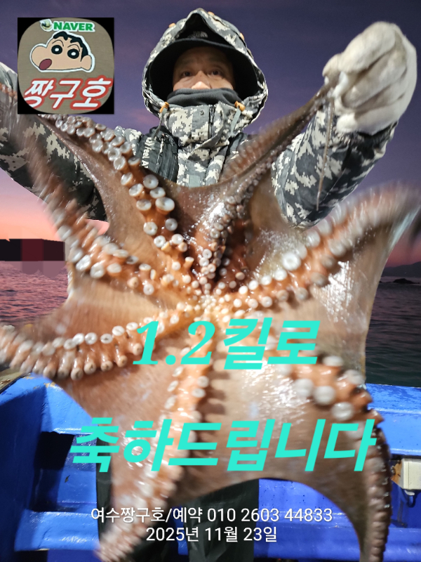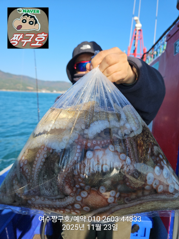 | 제목 : 여수 짱구호 11월23일(일)왕문어 1.5k 1.4k 1.3k 1.2k 1.1k 1.0k 조황(6수) | ||