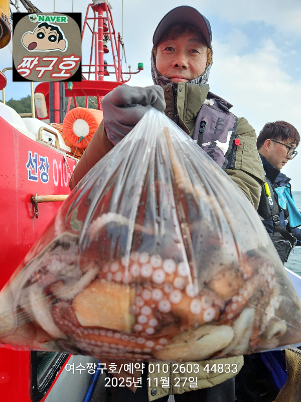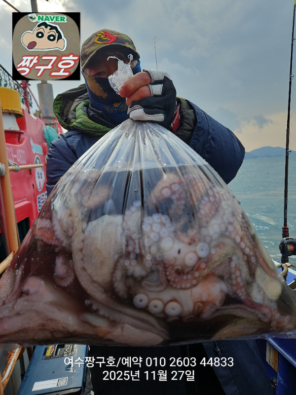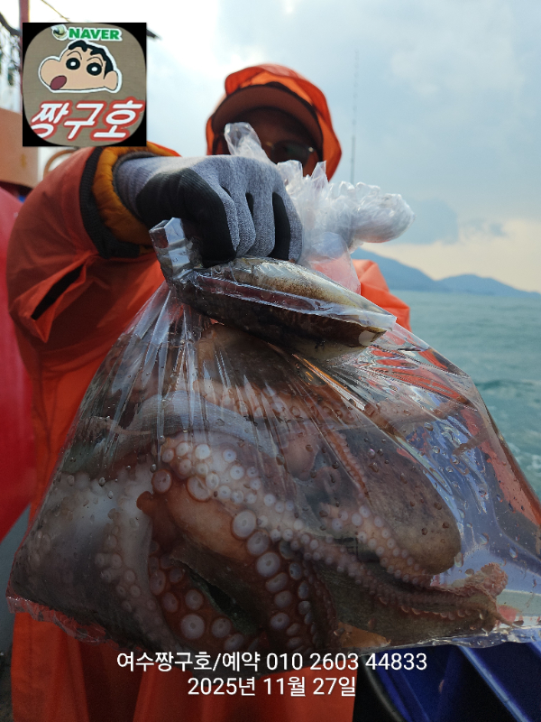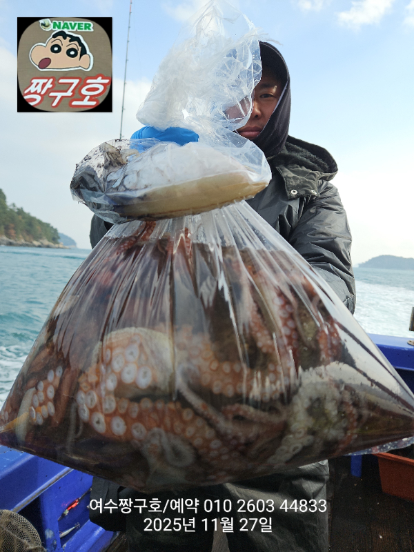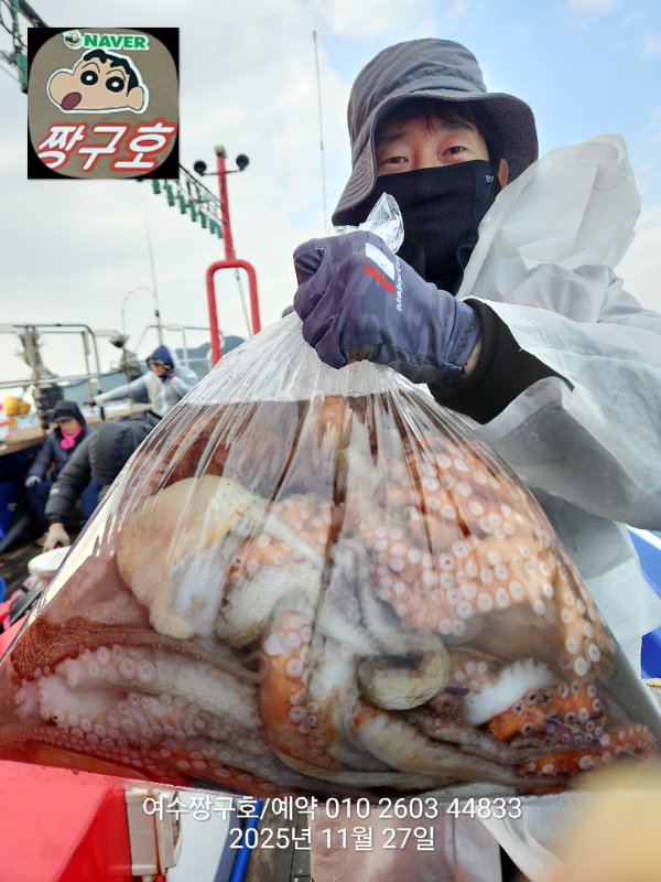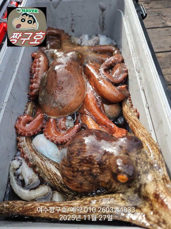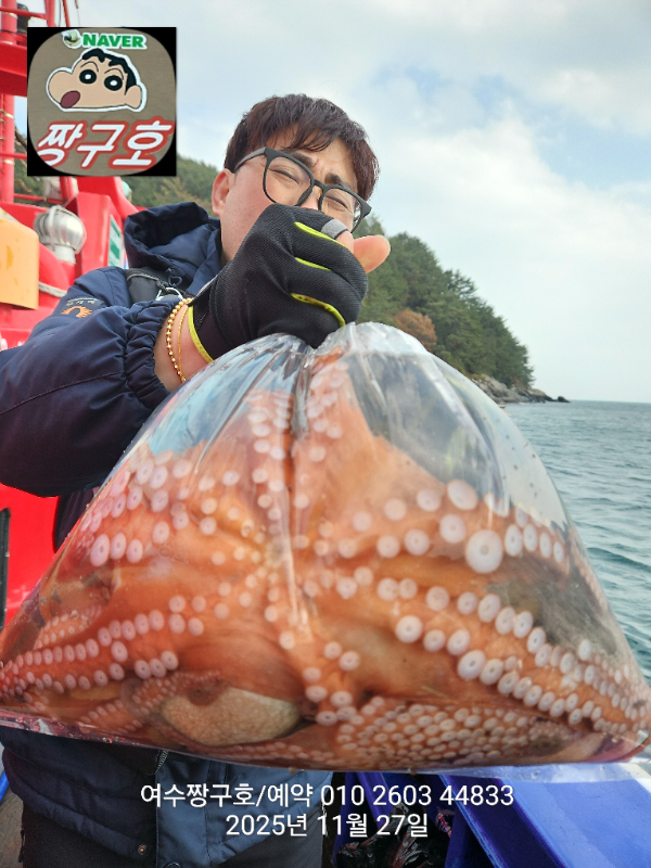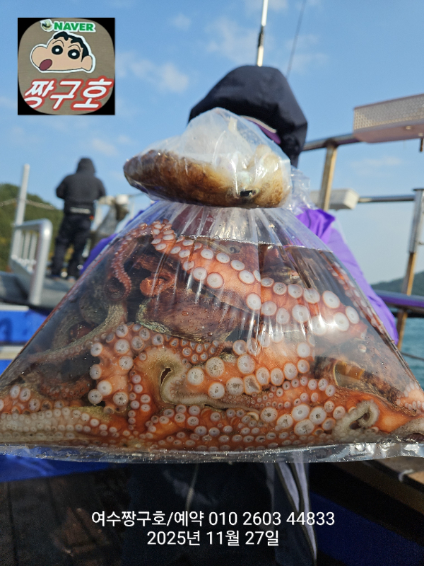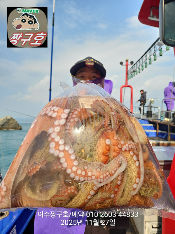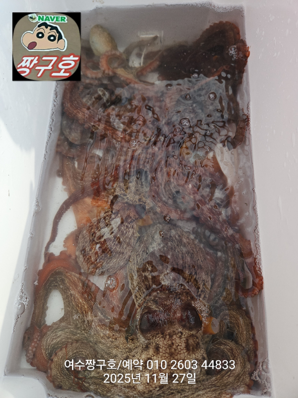 | 제목 : 여수 짱구호 11월27일(목)왕문어 1.59k 1.55k 1.4k 1.38k 1.2k 1.1k 1.0k 1.0k 조황(8수) | ||