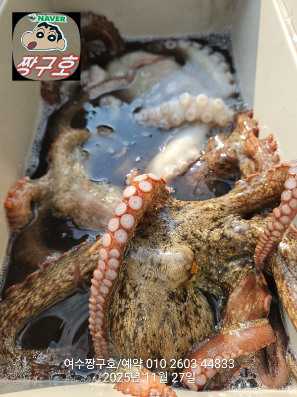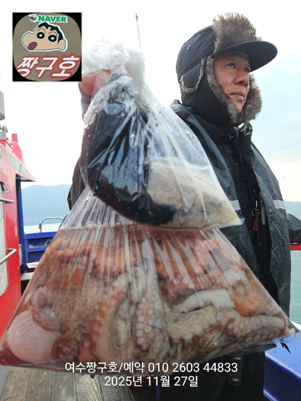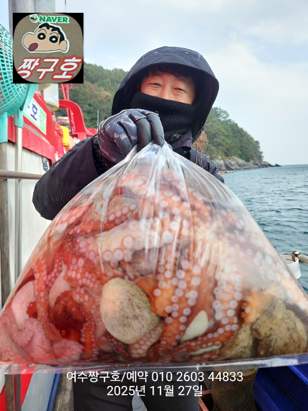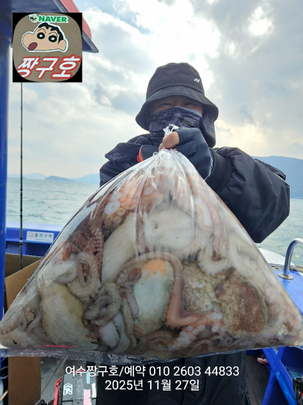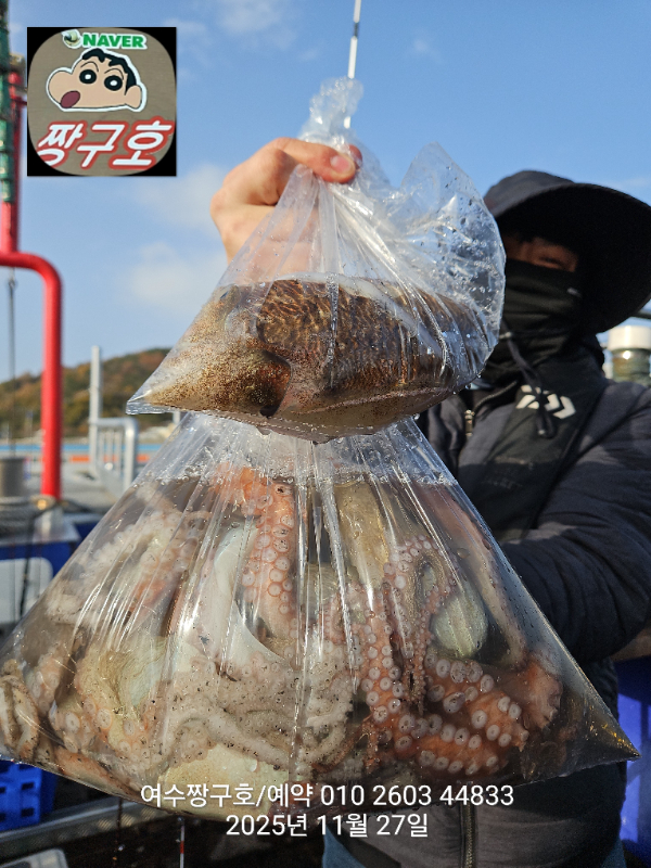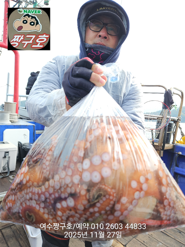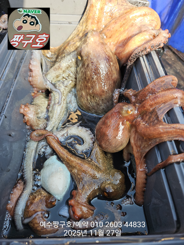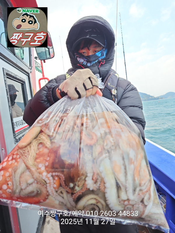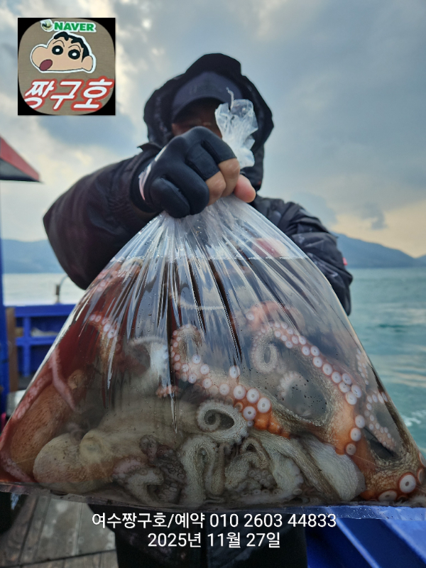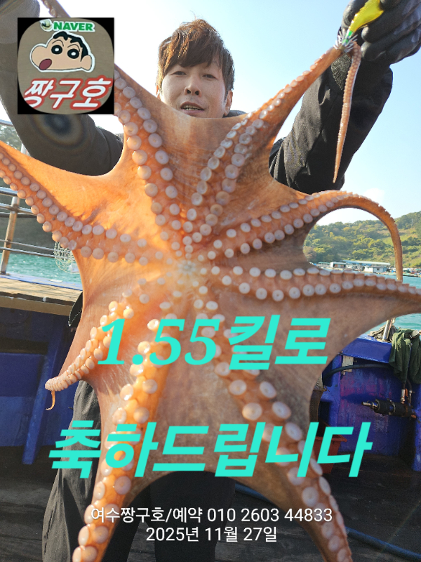| 제목 : 여수 짱구호 11월27일(목)왕문어 1.59k 1.55k 1.4k 1.38k 1.2k 1.1k 1.0k 1.0k 조황(8수) | ||