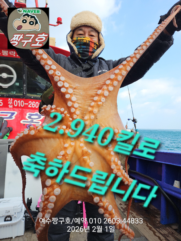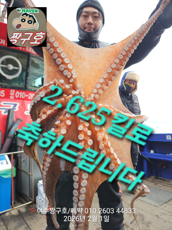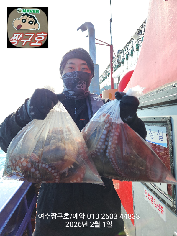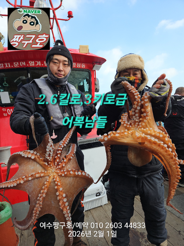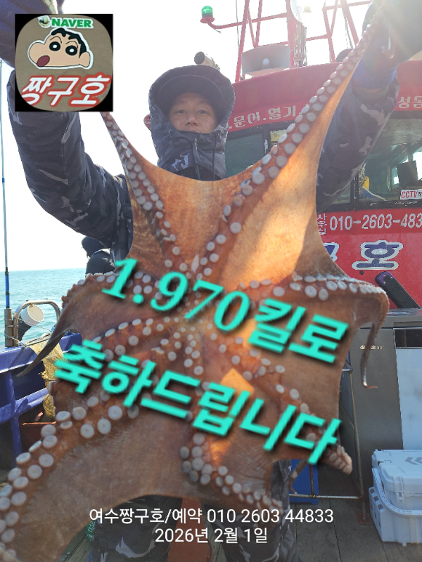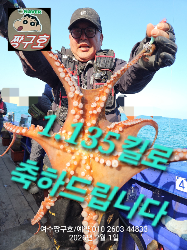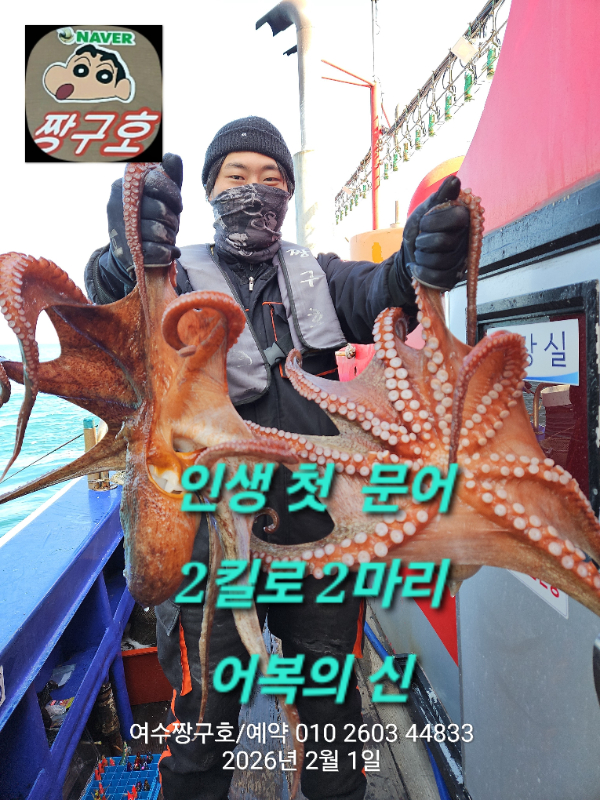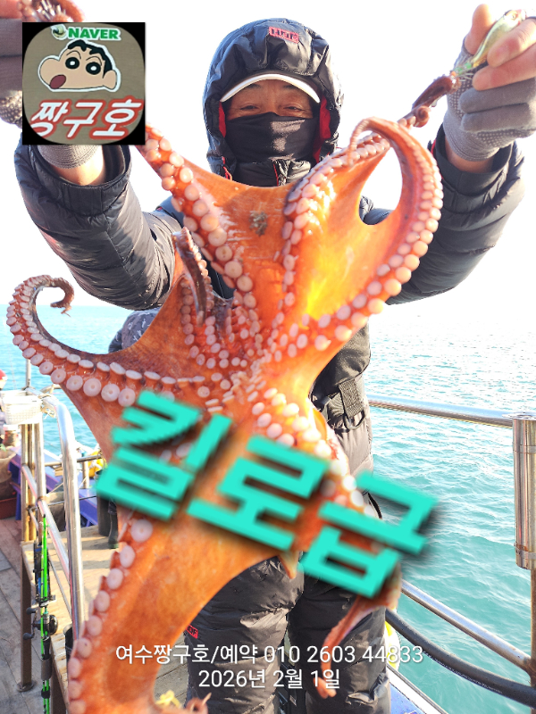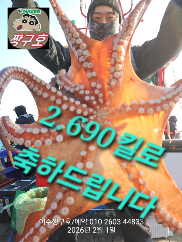 | 제목 : 여수 짱구호 1일(일) k왕문어 초대박 조황(6수) 2.94k 2.69k 2.62k 1.97k 1.13k 1.0k | ||